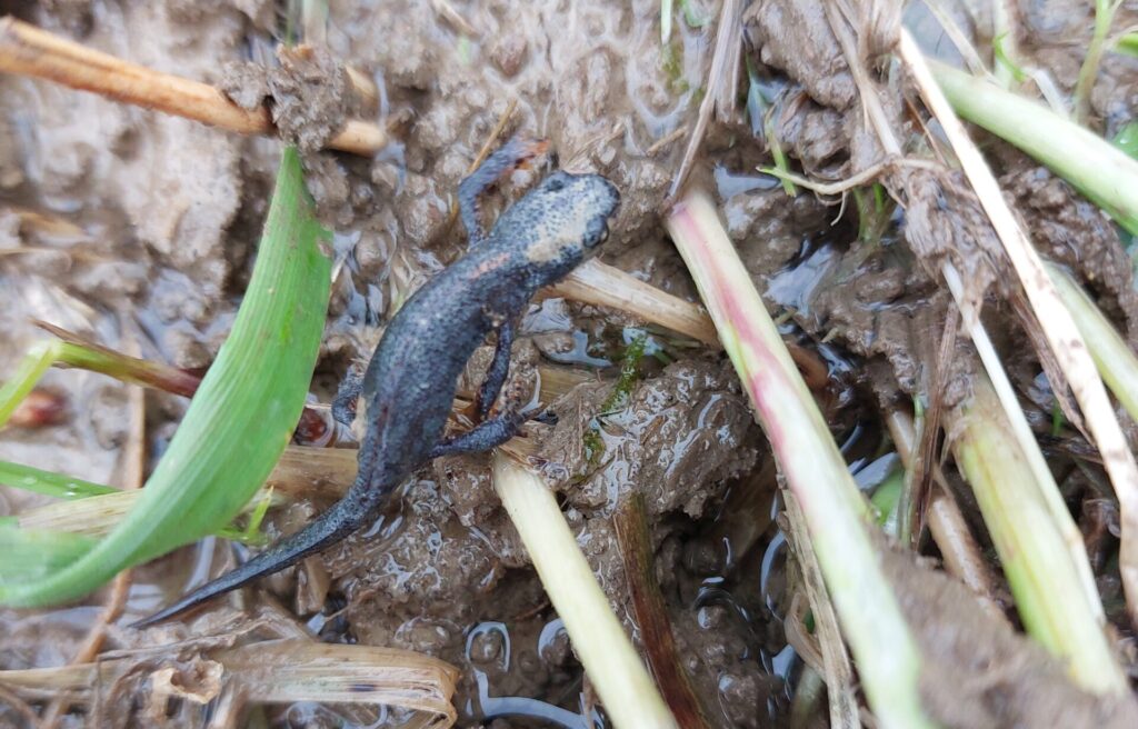 Tůně nám týden po výstavbě posvětil i čolek horský, který se objevil při dodělávkách prací u jedné z nich.